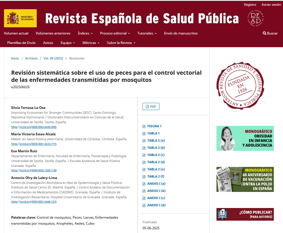 FUNDAMENTOS // Se estima que un 80% de la población mundial está en riesgo de contraer una enfermedad de transmisión vectorial, siendo los mosquitos los responsables de una mayor carga de enfermedad. Dado que el control biológico es una opción más natural que otras intervenciones disponibles y que el uso de peces está muy extendido, el objetivo de esta revisión fue analizar la eficacia de las intervenciones con peces para el control de las enfermedades transmitidas por mosquitos.