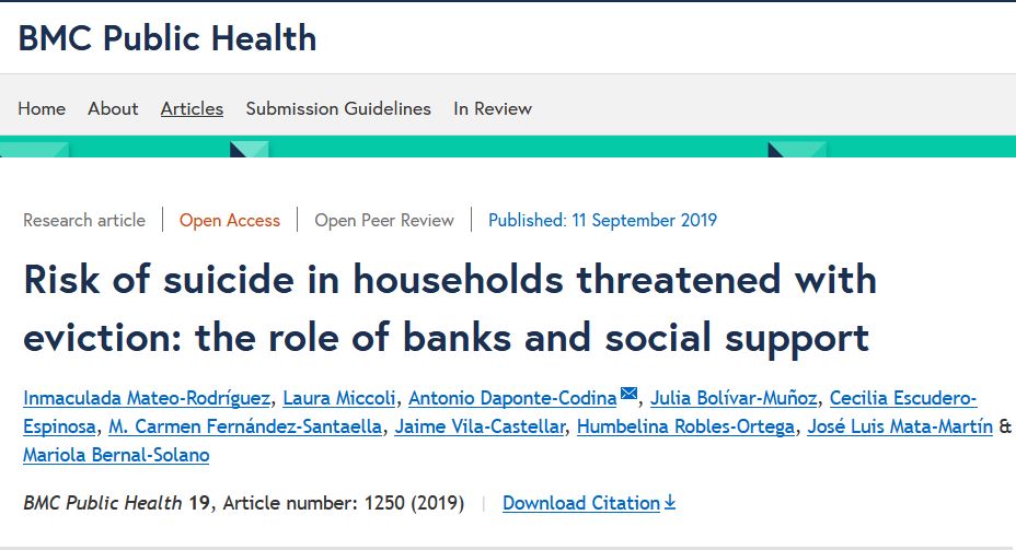 One of the greatest effects of the financial crisis in Spain has been the enormous increase in the number of evictions. Several studies have shown the association of evictions with different aspects of the physical and mental health. Furthermore, evictions have been associated with an increased risk of suicide. Our objective was to evaluate the risk of suicide among victims of eviction and investigate whether it is associated with specific characteristics of households and interviewees, the eviction process and social support, and health needs.