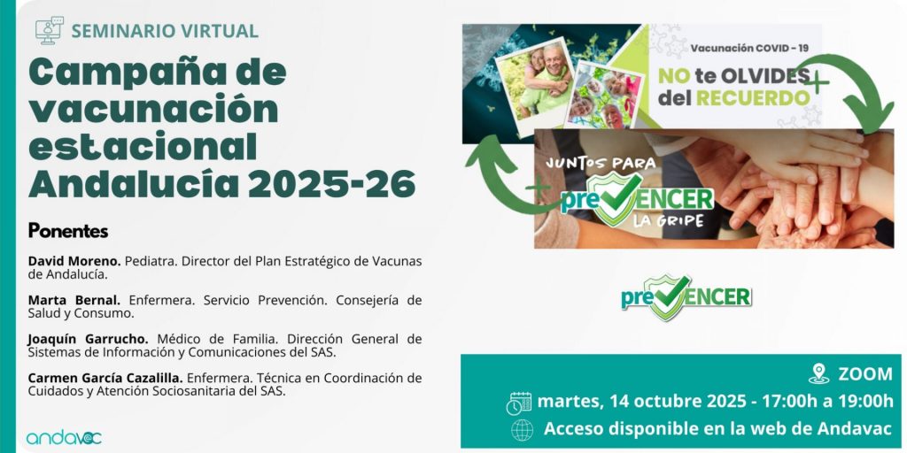 Nuevo seminario online donde David Moreno, Marta Bernal, Joaquín Garrucho y Carmen García nos presentarán las novedades para la Campaña de Vacunación Estacional en Andalucía para la temporada 2025-26.