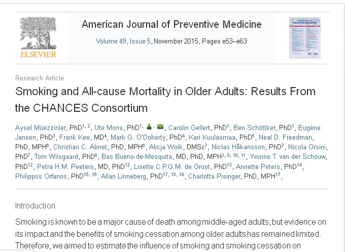 Smoking remains as a strong risk factor for premature mortality in older individuals and cessation remains beneficial even at advanced ages. Efforts to support smoking abstinence at all ages should be a public health priority.
