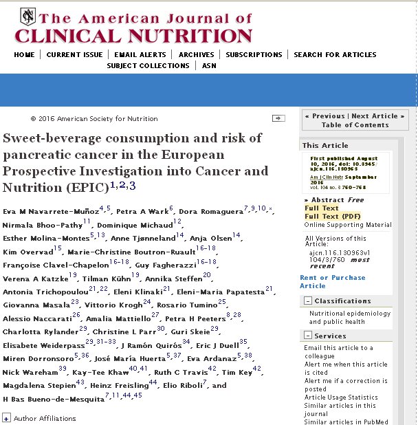 Objective: We examined the association between sweet-beverage consumption (including total, sugar-sweetened, and artificially sweetened soft drink and juice and nectar consumption) and pancreatic cancer risk.