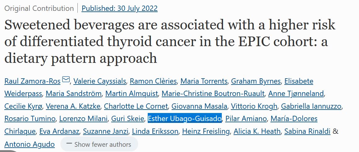 The investigation of dietary patterns detected that the consumption of sweetened beverages was associated with a higher risk of differentiated thyroid cancer. Our results are in line with the general dietary recommendations of reducing the consumption of sweetened beverages.