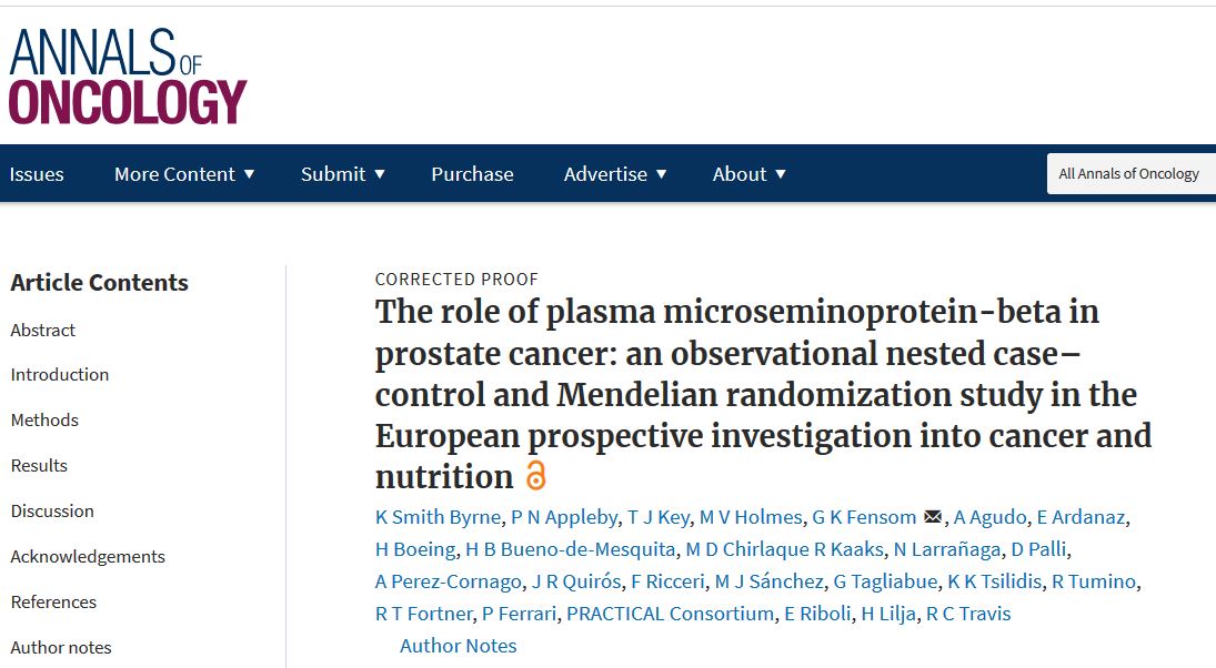 Plasma MSP concentrations were inversely associated with prostate cancer risk after adjusting for total prostate-specific antigen concentration [odds ratio (OR) highest versus lowest fourth of MSP = 0.65, 95% confidence interval (CI) 0.51–0.84, Ptrend = 0.001]. No heterogeneity in this association was observed by tumour stage or histological grade. Plasma MSP concentrations were 66% lower in rs10993994 TT compared with CC homozygotes (per allele difference in MSP: 6.09 ng/ml, 95% CI 5.56–6.61, r2=0.42). MR analyses supported a potentially causal protective association of MSP with prostate cancer risk (OR per 1 ng/ml increase in MSP for MR: 0.96, 95% CI 0.95–0.97 versus EPIC observational: 0.98, 95% CI 0.97–0.99). Limitations include lack of complete tumour subtype information and more complete information on the biological function of MSP.