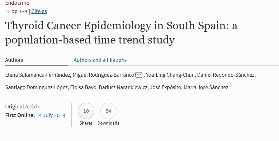 During the study period there were 1265 diagnosed cases of TC in Granada (72.6% in women). Incidence trends significantly increased in both men (APC: + 5.4%) and women (APC: + 4.7%). The most common histological types in both sexes were papillary (74.8%) and follicular (16.8%). The incidence has increased during the study period mainly due to papillary carcinoma, which has increased annually around 6% in both sexes. TC mortality trend during this period decreased in men (APC: −0.3%) and women (APC: −2.3%).