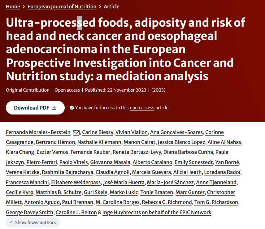 We reaffirmed that higher UPF consumption is associated with greater risk of HNC and OAC in EPIC. The proportion mediated via adiposity was small. Further research is required to investigate other mechanisms that may be at play (if there is indeed any causal effect of UPF consumption on these cancers).