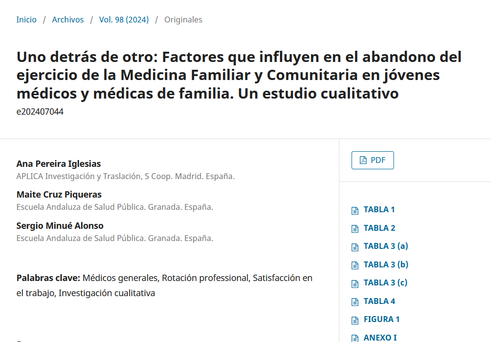 RESULTADOS // Los jóvenes médicos y médicas de familia abandonaban la Medicina Familiar y Comunitaria por la frustración de no poder ejercer como les gustaría, por insatisfacción laboral y por una visión pesimista de su futuro como trabajadores/as. La decisión de abandonar de estos jóvenes profesionales se vio favorecido por el empeoramiento de las condiciones laborales tras la pandemia y sus valores respecto al trabajo.