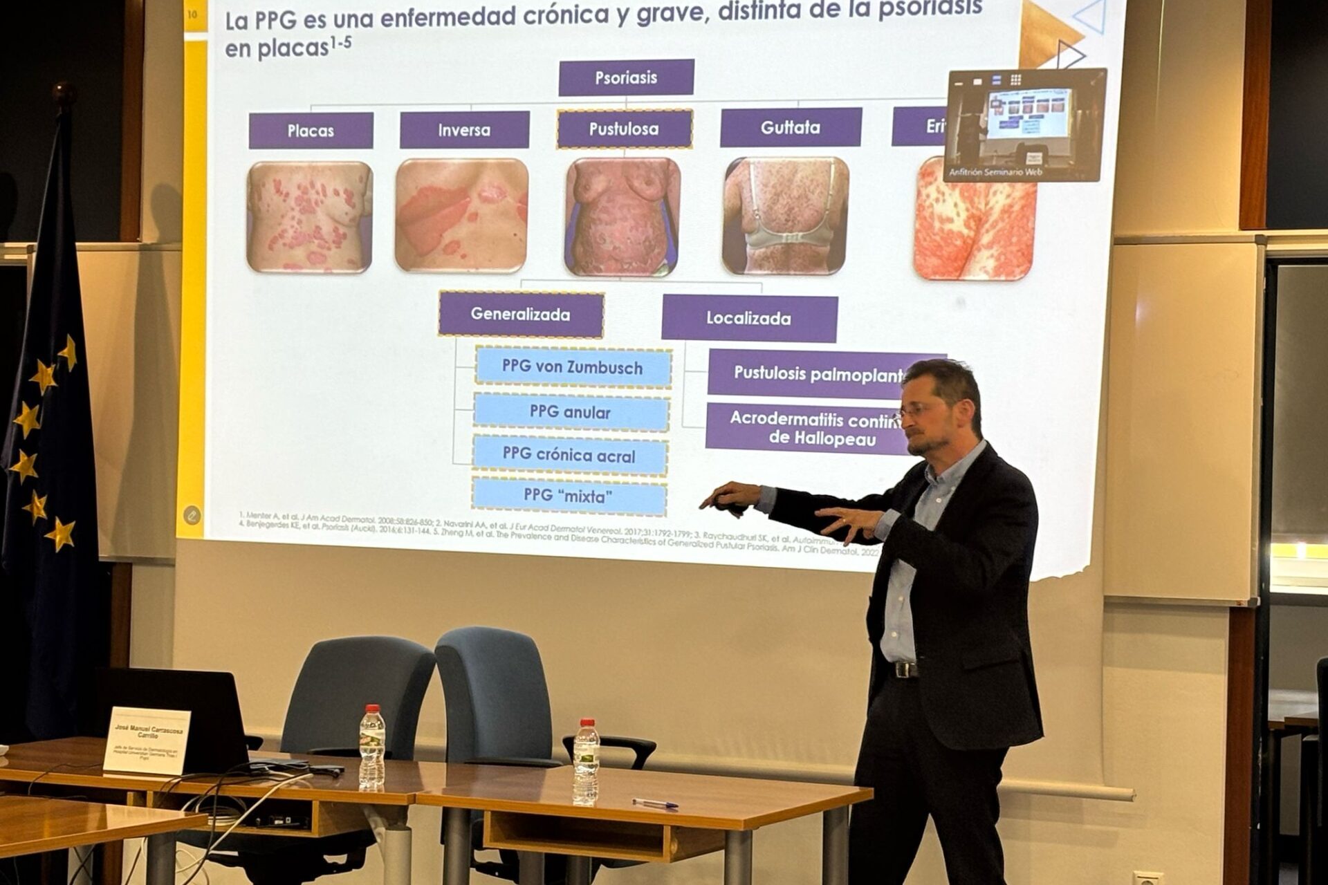 La PPG es una enfermedad minoritaria, autoinflamatoria, grave y multisistémica que se caracteriza principalmente por la aparición de pústulas primarias, estériles y visibles macroscópicamente en zonas de piel no acral, a diferencia de la psoriasis en placas, que se caracteriza por la aparición de placas escamosas, rojas y engrosadas en zonas de piel como el cuero cabelludo, los codos y las rodillas. Los brotes son característicos de la evolución clínica de la PPG, y algunos pacientes presentan enfermedad recidivante con brotes recurrentes y otros presentan una enfermedad persistente con brotes intermitentes. En la PPG predominan diferentes vías inflamatorias frente a la psoriasis en placas.