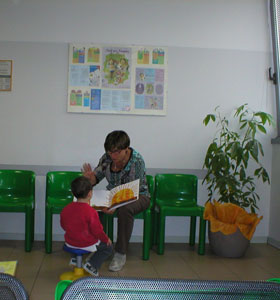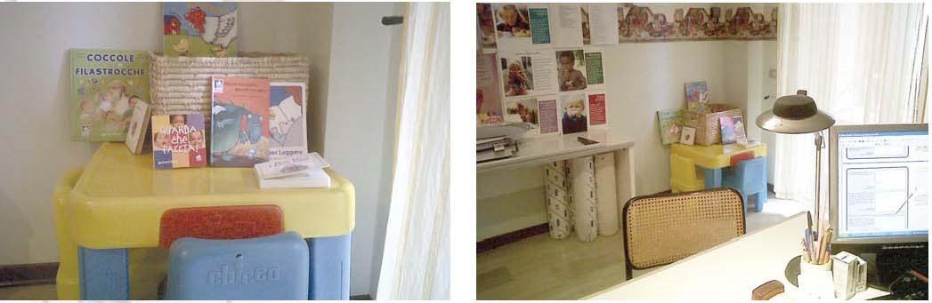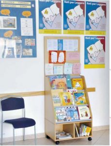 En las consultas adheridas al proyecto Nati per Leggere, concretamente en la sala de espera se habilita un espacio para los niños. Junto a una pared se coloca una estantería pequeña o contenedor bajo para poner libros que lleven la etiqueta de la biblioteca municipal que ha prestado dichos libros, que a su vez serán cambiados por otros títulos cada mes.