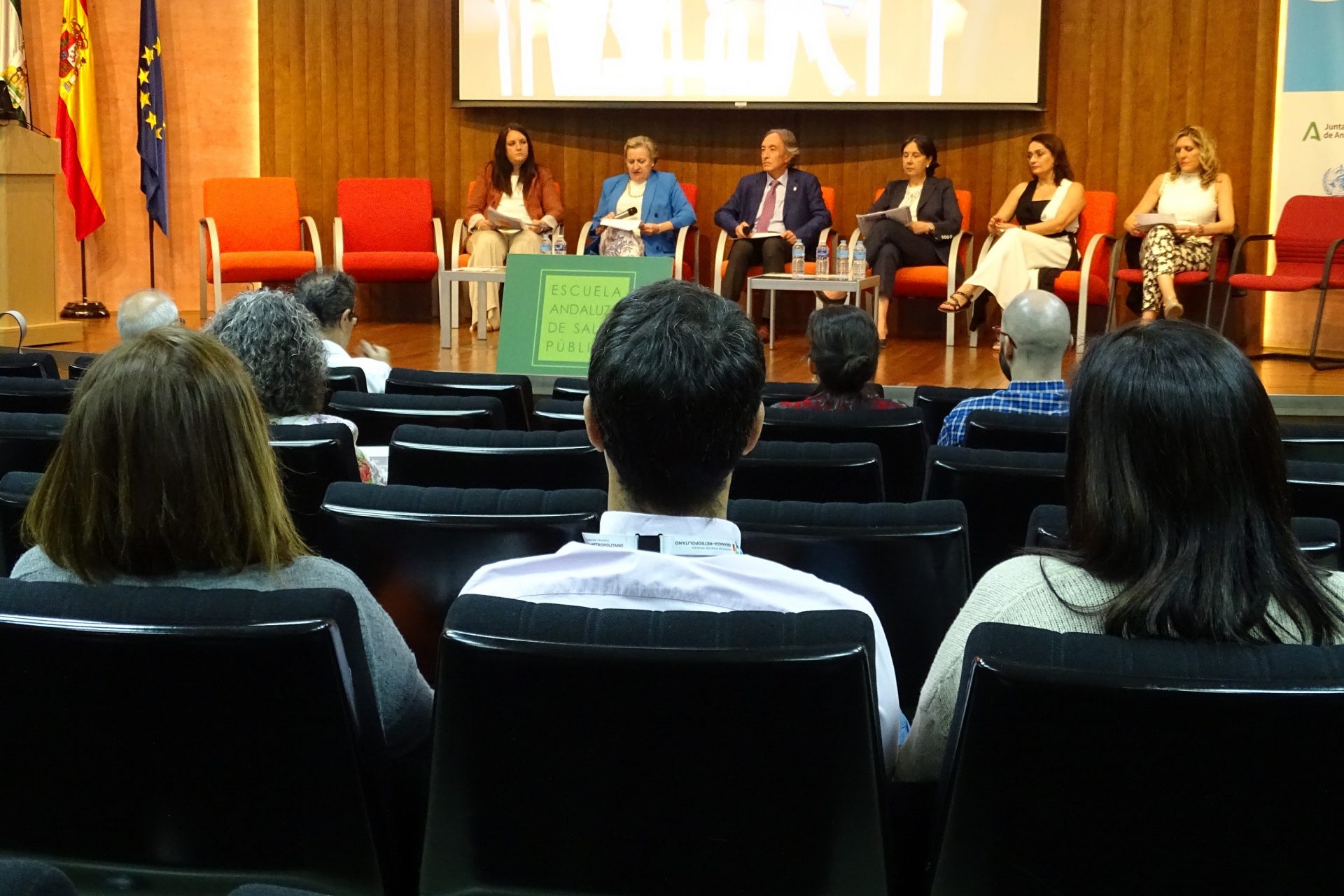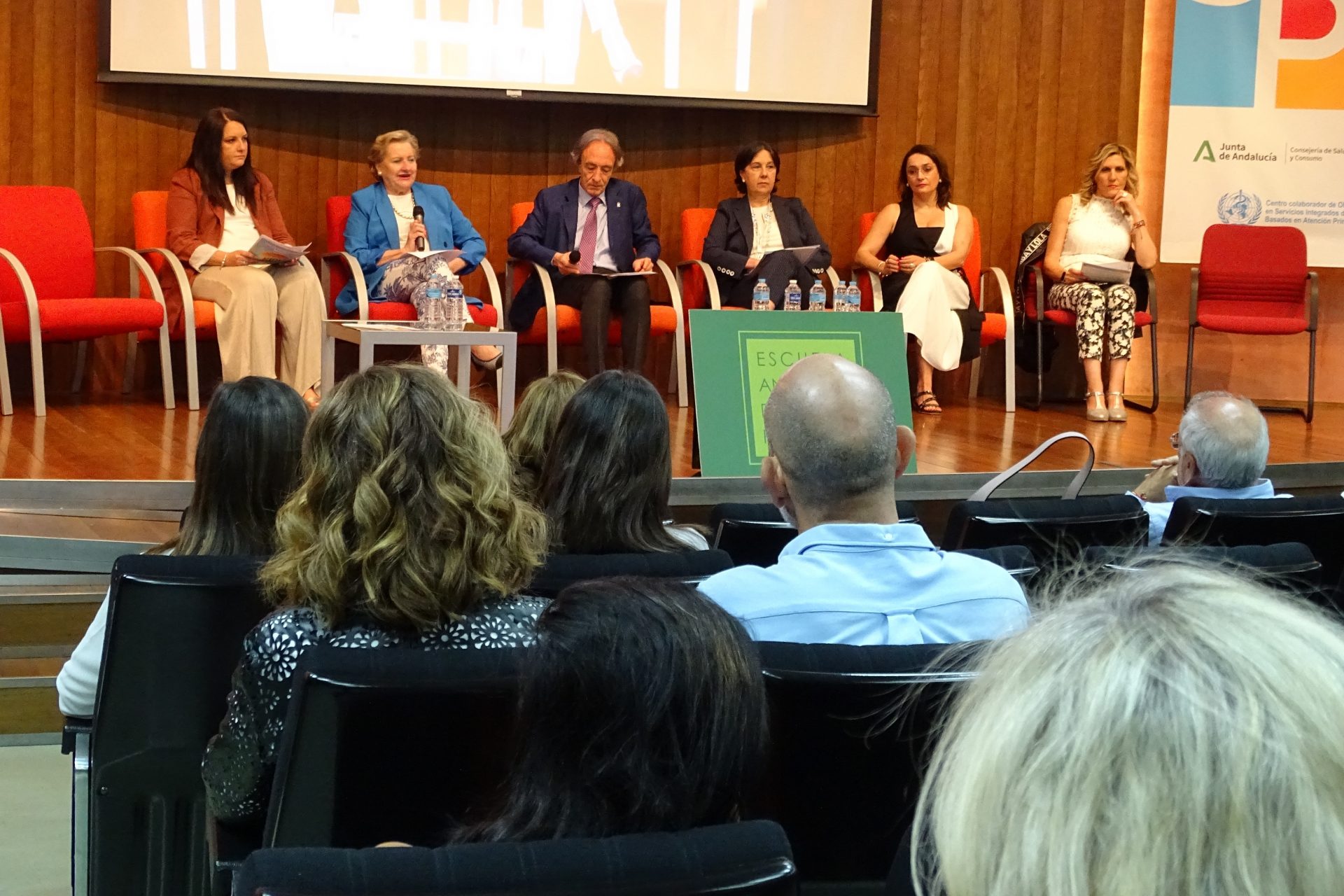 El delegado territorial de Salud y Consumo en Granada, Indalecio Sánchez-Montesinos preside el acto de bienvenida junto a la directora Gerente de la EASP, Blanca Fernández-Capel, la gerente del distrito Sanitario de AP Granada-Metropolitano, Leticia Soriano, la vicedecana del Colegio Oriental de Psicología, Celina Jiménez, la farmacéutica de AP y técnico de apoyo del Servicio de Proyectos y Desarrollo, Ingrid Ferrer, y la trabajadora social del CS Zaidín , María Dolores González.