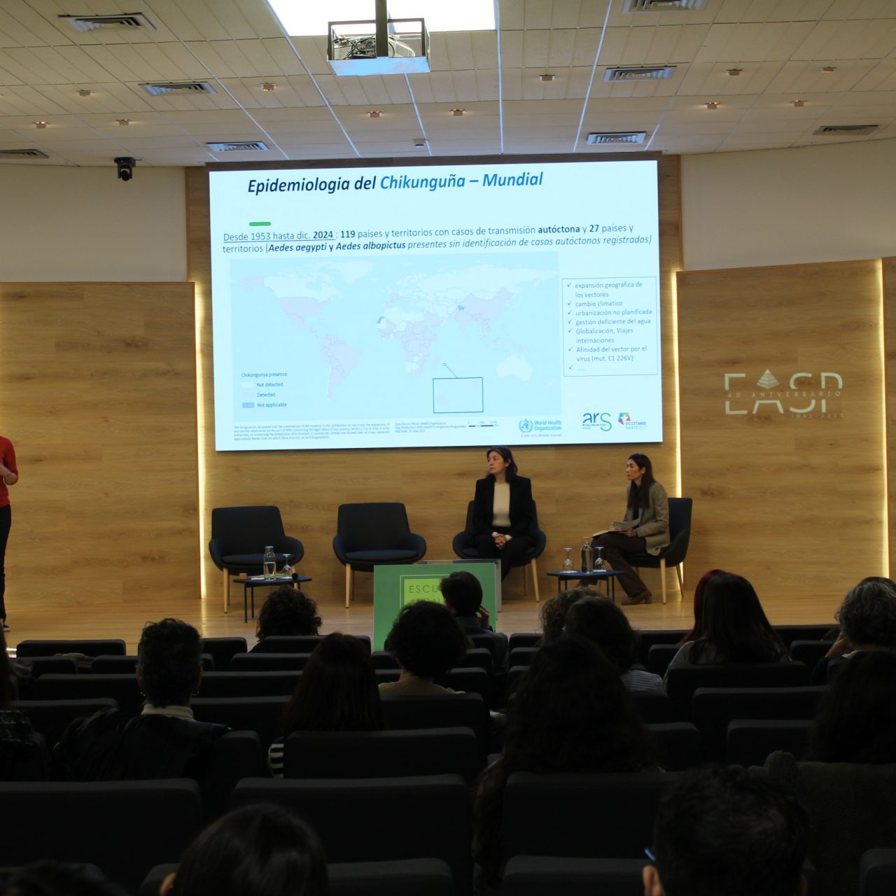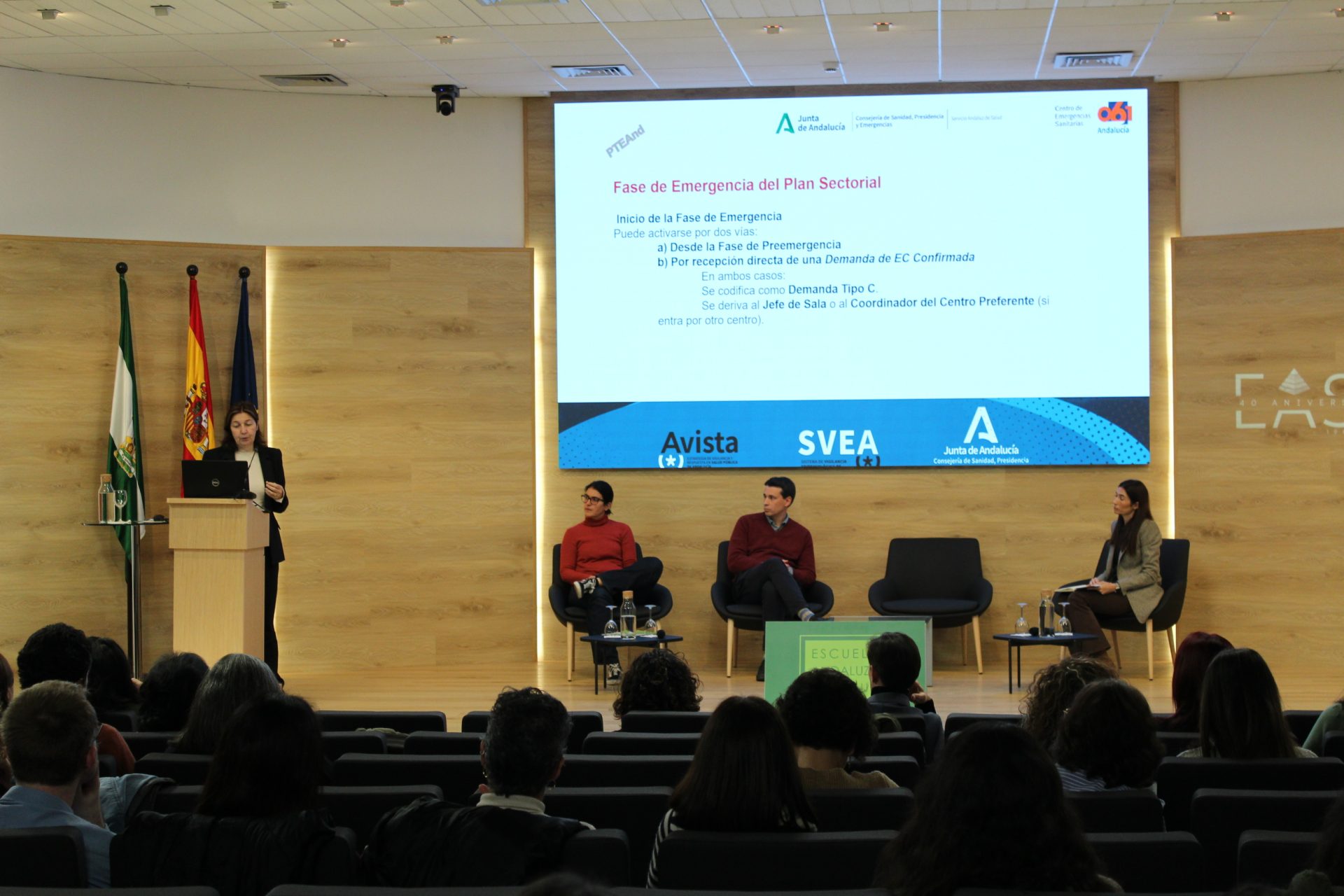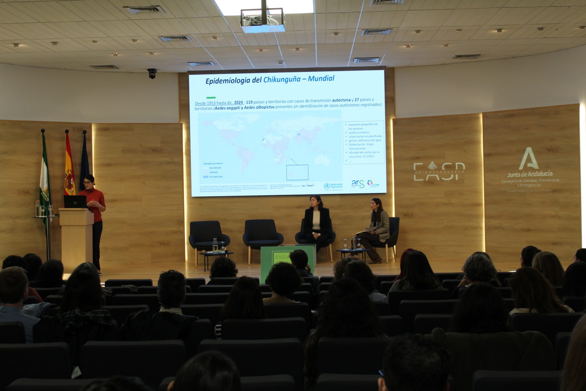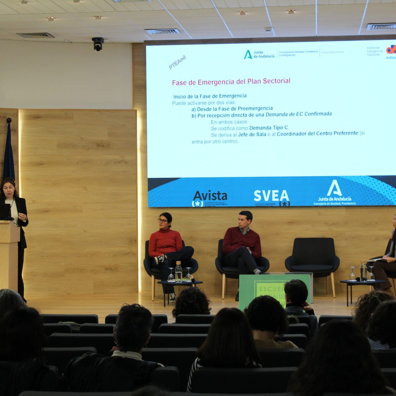 La primera ponencia ha estado dedicada al Plan Estatal de Preparación y Respuesta frente a amenazas graves para la salud, impartida por Josefa Sierra Moros, del Centro de Coordinación de Alertas y Emergencias Sanitarias. A continuación, se ha celebrado la primera mesa de la jornada, centrada en la coordinación intersectorial en la gestión de alertas y emergencias en Andalucía. En este espacio se han abordado, entre otros aspectos, la organización autonómica en la respuesta ante alertas de salud pública, la experiencia de gestión de casos de chikungunya en el sur de Francia, a cargo de la doctora Laura Catalá, consejera médica de la Agencia Regional de Salud de Occitania, y el papel del Centro Coordinador de Emergencias Sanitarias 061 ante demandas epidemiológicas y emergencias colectivas.