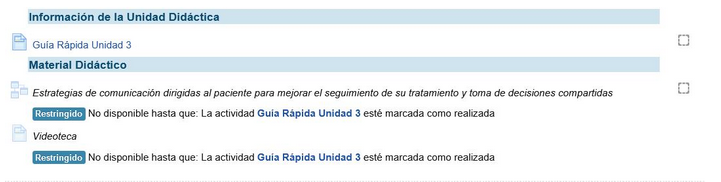 Podéis ahora fijaros en el icono que os aparece en el lado derecho de algunos recursos. Este icono indica que estos recursos son obligatorios para finalizar el curso, y a medida que los vayáis cumpliendo aparecerán marcados. Podemos llamarlos "check" de seguimiento.