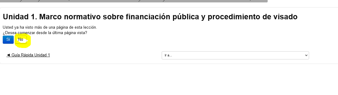 Para volver a visualizar una presentación o contenido de una lección debes acceder a la lección que quieres revisar, y cuando te pregunta “Desea comenzar desde la última página vista? Debes responder que “NO”.