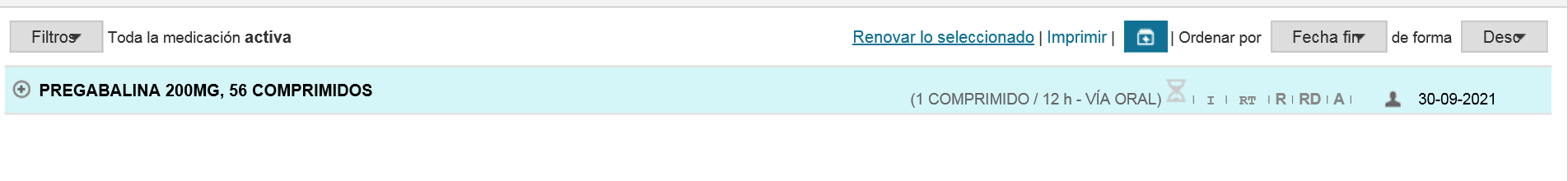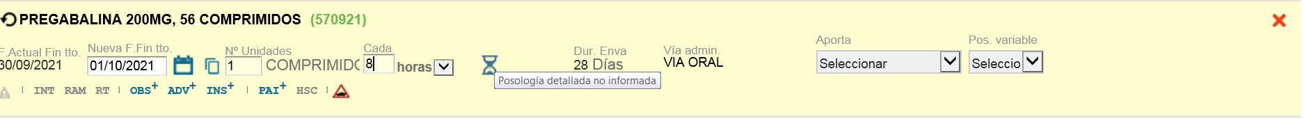 P: Buenas tardes, tengo duda respecto a dispensación detallada, cuando tengo una prescripción realizada y quiero renovar pero modificando posología, dónde debo pulsar porque el reloj está en gris, es decir desactivado, y tengo que anular y realizar nueva dispensación donde ya me lo permite.