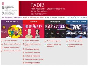 En programas de prevención en el ámbito escolar en baleares existe los que promueve el PADIB (Plan de adicciones y drogodependencias en les Islas Baleares) que son: Bon día Salud, Respiraire, Decideix y THC supera el reto, dos de ellos están en la web http://prevencionbasadaenlaevidencia.net/. Son los mismos que también propone los centros educativos promotores de la salud en les Illes Balears. En los centros educativos también profesionales del centro de salud pueden realizar Taller de prevención del consumo de sustancias tóxicas para jóvenes de ESO, siempre que este aprobado por la comisión de salud del centro educativo. La composición de las comisiones de salud de los centros promotores es variable. Es frecuente en los Institutos de educación secundaria que a parte de la comunidad educativa (profesores, padres-madres de alumnos, alumnos) haya el policía tutor, el centro de salud de la zona y servicios sociales del ayuntamiento. En esta comisión se decide que actividades se van a realizar en el centro educativo con respecto a la salud y quién las va a realizar. Este último taller no ha sido evaluado en resultados, si que los centros de salud que lo realizan hacen una memoria en la que hay una pequeña evaluación de estructura y de proceso. Este protocolo surgió como necesidad de los profesionales de los centros de salud al ir a la Consulta Jove en los institutos resolver las múltiples dudas que tenían con respecto a las drogas de una manera lo más saludable posible.